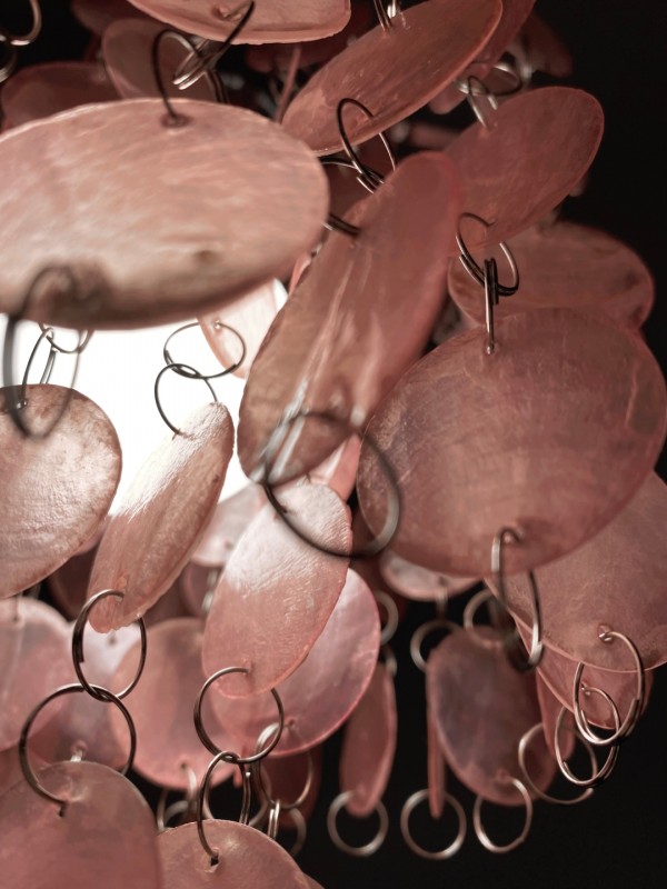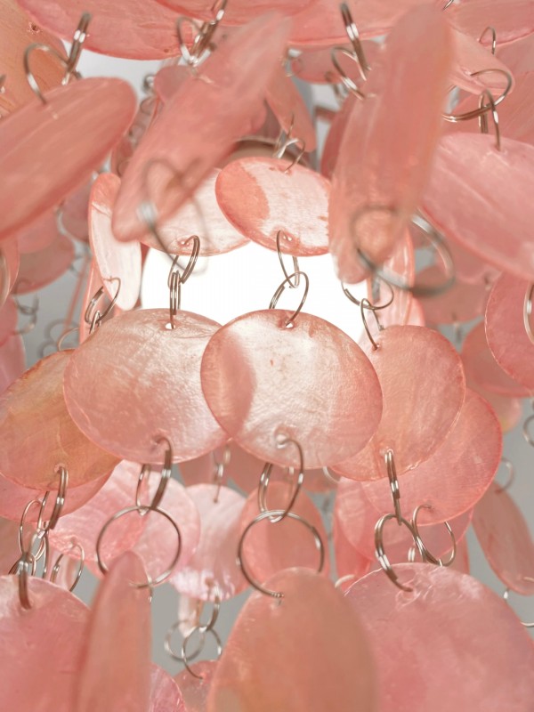 Круглое металллическое потолочное крепление и тонкий провод надёжно удерживают каркас и позволяют регулировать высоту, на которой будет размещён светильник. В несколько рядов по окружности расположены круглые декоративные элементы сделанные из натуральных полированных раковин розового цвета, диаметром 50мм. Они вертикально свисают на коротких тонких цепочках и красиво играя светом в пространстве Вашей комнаты.