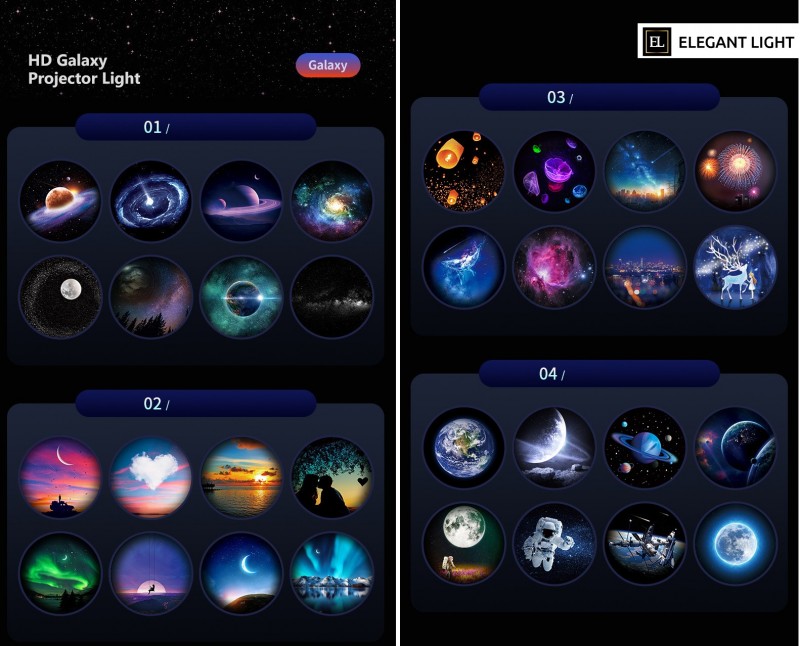Представляем вам отличную модель домашнего проектора GALAXY. Это устройство создаст очень красивые тематические проекции в любом помещении. В вашей спальне или в детской комнате появится ночное небо, полное ярких звезд с луной, планетами и множество других проекций! Уникальной особенностью проектора является выбор тематик проекционных слайдов, т. к. помимо космической темы, в комплекте есть серия красивейших закатов и романтическая тематика. Все это точно не оставит никого равнодушным. Слайды размещены на специальных сменных дисках по 8 штук на каждом. В комплекте идет 4 таких тематических диска, т. е. вы получаете 32 слайда с неповторяющимися проекциями. В зависимости от поставки изображения на дисках могут обновляться, оставаясь при этом в рамках одной тематики диска (космос, романтика и т. д.).